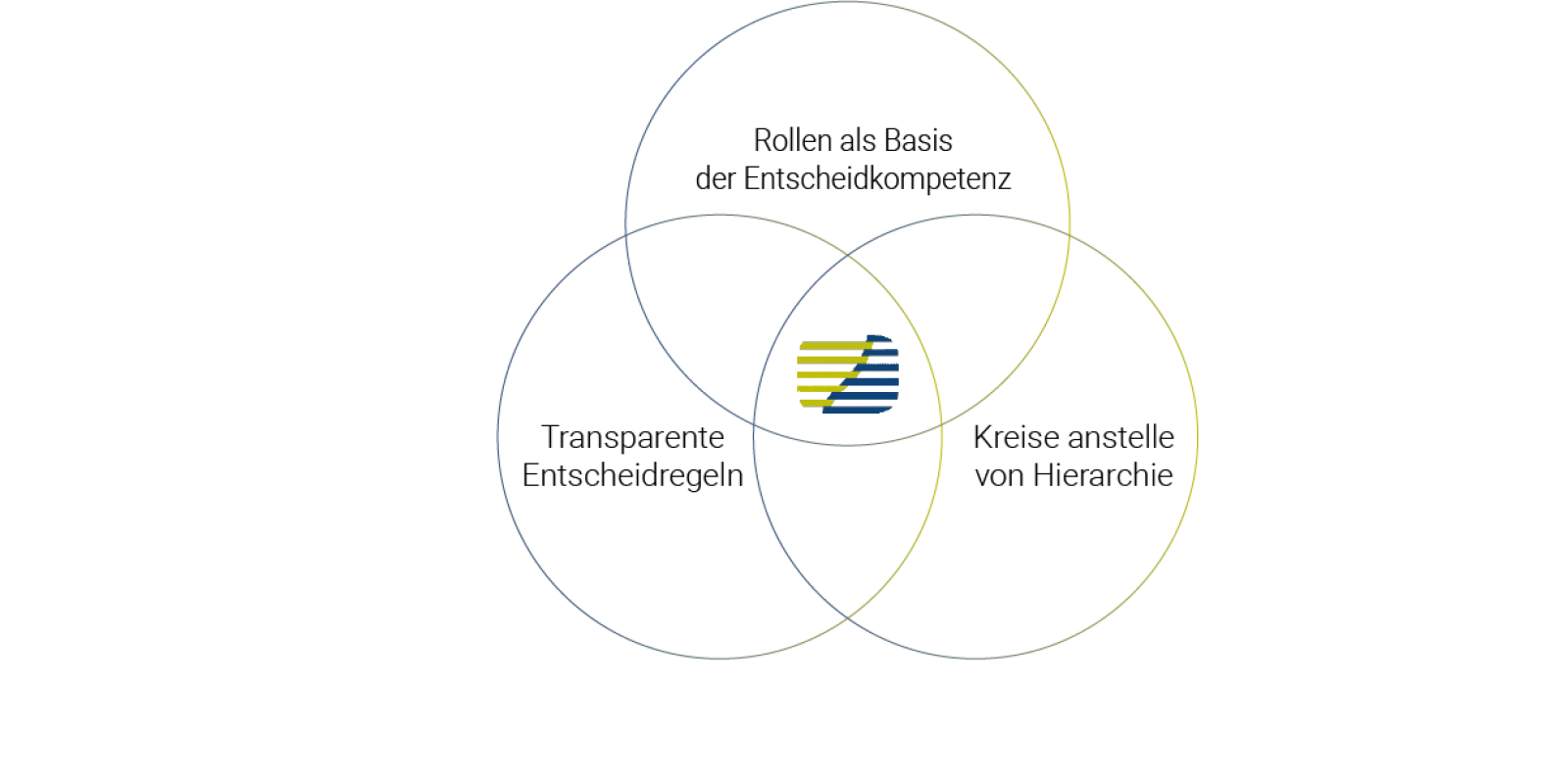 - Kreise anstelle von Hierarchien: Anstelle einer hierarchischen Organisation bilden Kreise die Grundlage der Zusammenarbeit. Die Kreise mit ihren Subkreisen organisieren sich dabei selber und entscheiden gemäss den zugeteilten Kompetenzen.
