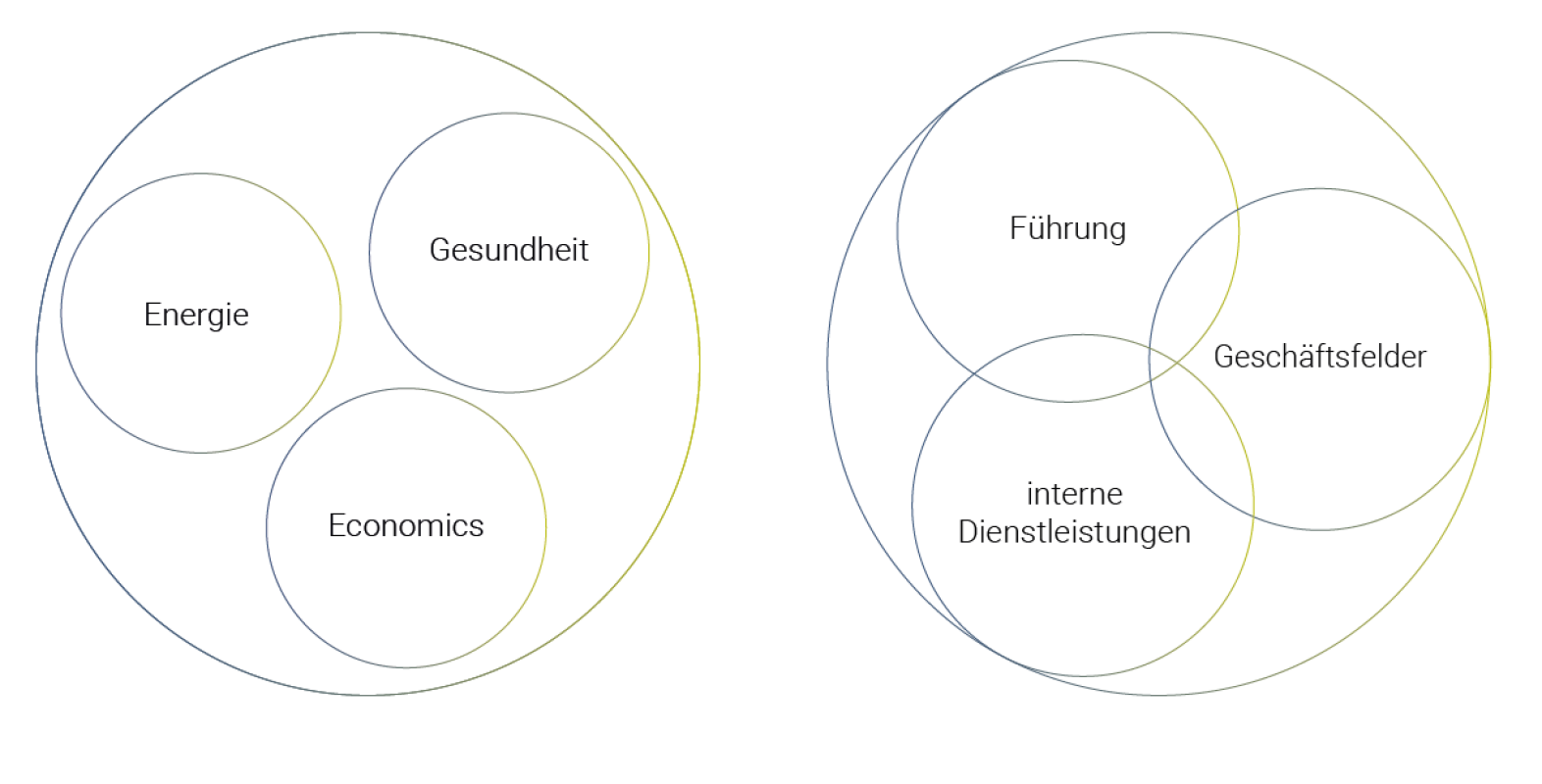 Unsere Mitarbeitenden arbeiten jeweils in mehreren Rollen und Kreisen mit. Wir unterscheiden Kreise der Führungsebene und Kreise der operativen Ebene, wobei der Kunde immer im Zentrum steht.