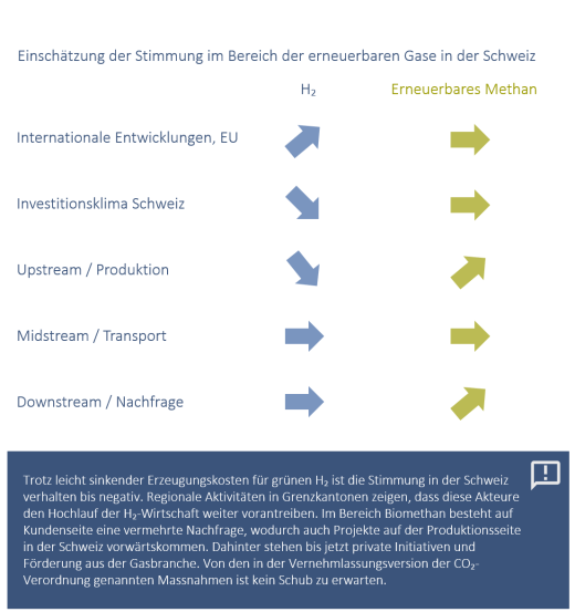 L'offre et la demande de biométhane se développent de manière positive en Suisse, grâce aux initiatives privées et à la promotion de la branche gazière. Un grand potentiel réside dans l'utilisation des engrais de ferme, mais la Suisse, dont l'agriculture est plutôt organisée sur de petites surfacesface des défis supplémentaires. La version de la nouvelle ordonnance sur le CO₂, encore en consultation jusqu'au 17 octobre, ne donnera guère un coup de pouce supplémentaire.